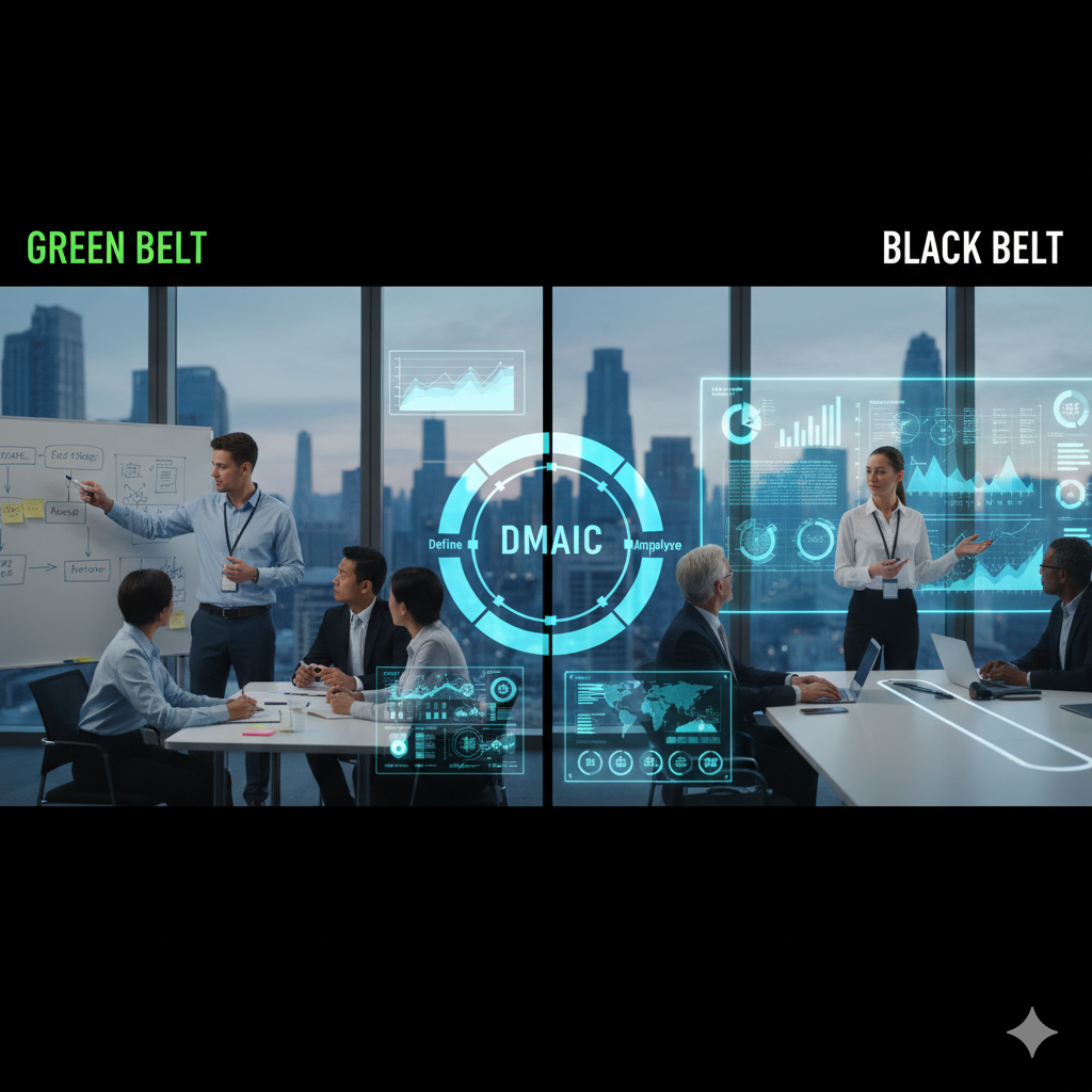 Het belangrijkste verschil zit in de rol en diepgang: een Green Belt leidt verbeterprojecten binnen het eigen team, terwijl een Black Belt complexe, cross-functionele projecten aanstuurt en andere Green Belts coacht. De Black Belt training duurt langer en gaat dieper in op statistische analyse.